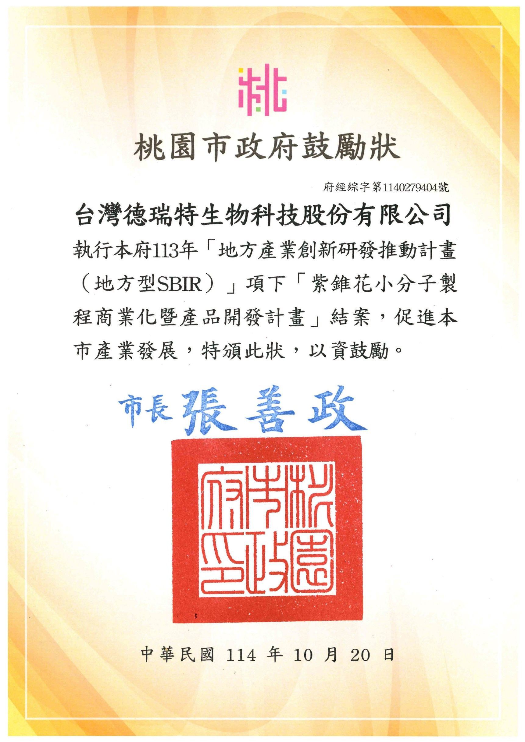 台灣德瑞特持續以「創新、專業、健康」為企業核心價值,積極投入保健食品與原料研發領域。近日榮獲 「113 年 SBIR 桃園地方產業創新研發推動計劃」鼓勵狀,此次計劃主題為 「紫錐花小分子製程商業化暨產品開發」,充分展現德瑞特在研發創新與技術落地化的堅實實力。