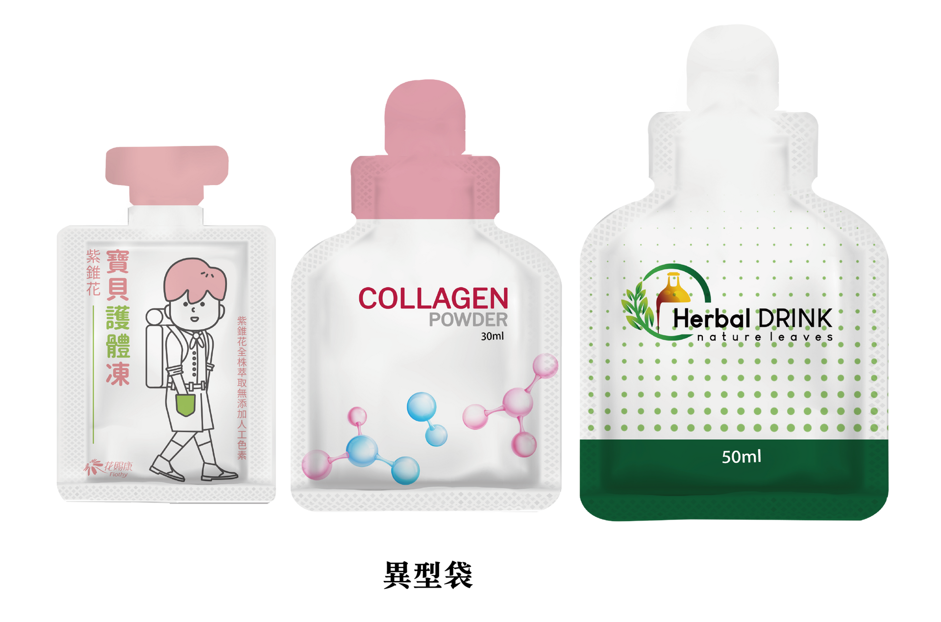 德瑞特提供水剂与果冻条产品多样化的包装选择,水剂包含Tritan 瓶、玻璃瓶、皇冠瓶、喷剂、滴剂等形式,铝袋则提供三封袋、背封袋、异形袋等,皆可依需求弹性调整。另提供专业包装设计服务,从材质选择到视觉呈现,协助打造兼具实用性与品牌识别度的产品外观。